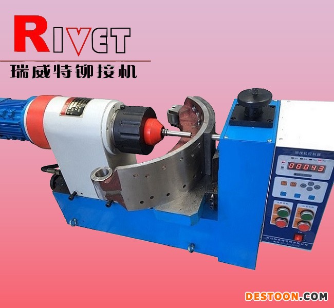 BM9W-C是为专为适应 大型汽车制动蹄铁行业用户大铆接直径、大批量而设计的一类新型卧式铆接机。 与BM9W不同的是除胜任BM9W能加工的产品外,进行了改进,可加工大型蹄铁产品,象富华、斯泰尔等宽度达220mm的产品。该机应用有第五代摆辗铆接技术外,同时采用双丝杆升降方案,即丝杆升降式工作台和丝杆升降式工作头。台面可支撑重、大工件,垂直工作台中心孔径与主轴轴线同轴,可用于夹具定位。油路加装单向调节阀,有效控制铆接速度。电控部分加装数显时间继电器、数显计数器,方便操控。油箱部分与机身可分可合,方便运输和组装。电控箱安装方式多样,可安装在机身侧面,也可安装于底座侧面,同时也可独立出来。当电控箱采用不同的安装方式,设备使用方式也会多种多样,除卧式外还可立式进行铆接作业。本机型为针对蹄铁行业专门设计,使用反映良好,为该行业首推机型。本机型已申请国家专利,国内仅本公司现行生产。
