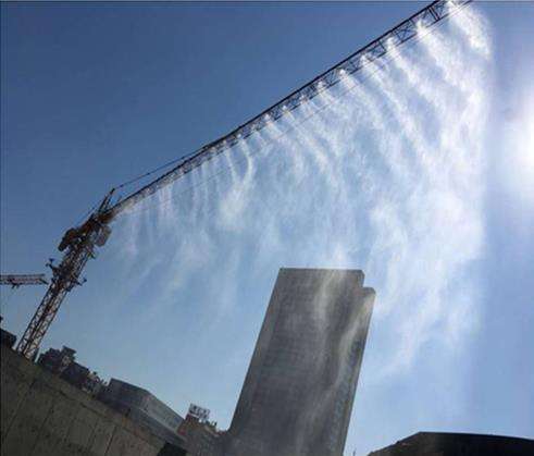喷淋降尘: 利用降水井或消防水池上中的水通过“高空喷淋降尘系统”形成飘飞的飞雾,吸附空中的灰尘颗粒和杂质,在现场风速低于二级风情况下,可使施工现场大气中颗粒物浓度减少84%,同时在高空喷淋一段时间后,地面将形成一片湿润状态,有效灰尘的再次扬起。