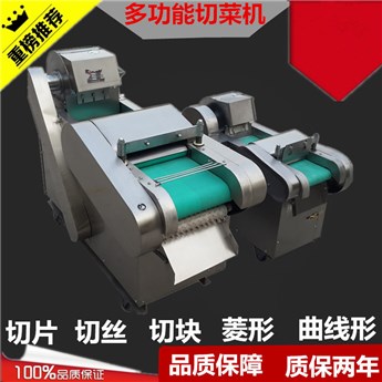 主要有机架、输送带、压菜带、切片机构组成。切片用于果蔬类硬菜的切片,片厚可在一定范围内自由调节,竖刀部分可将叶类软菜或切好的片加工成不同规格的块、丁、菱形等形状。切菜长度在一定范围内调整。因模拟手工切菜原理,加工表面平整规则,可切蔬菜组织完好,保持新鲜。