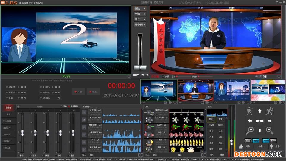 十、 丰富的背景配乐、音效、动画叠加;多路声音控制调音台,支持随切声音和混音播出,支持监听与降噪