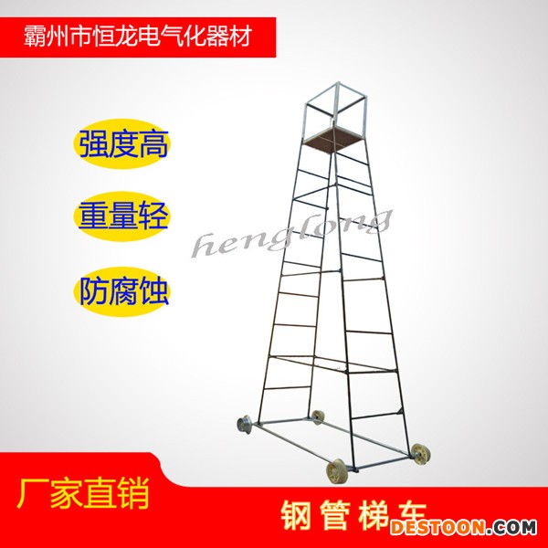 梯车选用铝合金材料制成,型材截面设计合理、重量轻,梯车底架用钢管连接,保证了底架的稳定性和安全性,不变形。梯车轮采用稀土尼龙轮,强度高,运转无噪音,其中有一车轮镶嵌钢环,从而安全接地。