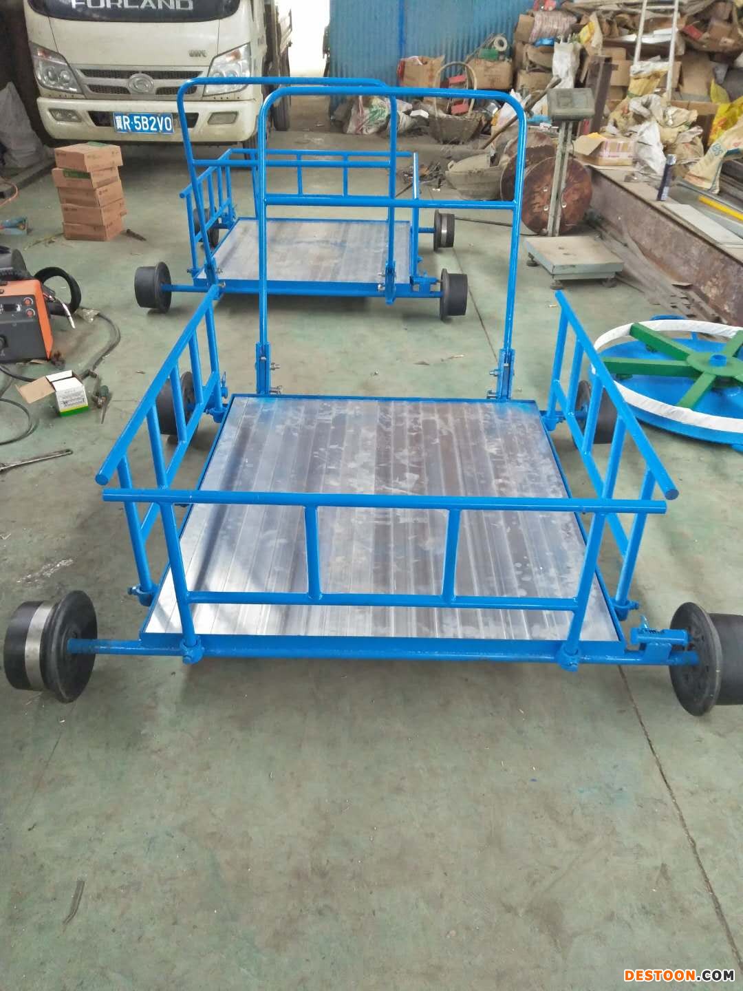 机构简单,成本较低,是铁路施工过跨较常见的运输工具车,车轮采用尼龙材质,保证了与车体的绝缘性,台面可拆卸组装,方便运输。
