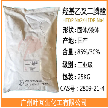 羟基亚乙基二膦酸(Etidronic acid),是一种有机化合物,分子式是C2H8O7P2,分子量为206.03,白色结晶颗粒,溶水为无色至淡黄色液体。本品易溶于水,溶于甲醇和乙醇。在水中有较大离解常数,能与金属离子生成稳定络合物。能与含活泼氧的化合物形成稳定的加成物,使活泼氧保持稳定。毒性小。