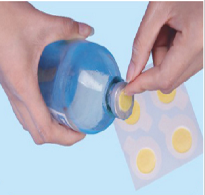 【产品描述】:瓶口贴的基本结构为基带PE膜上涂医用压敏胶,中间放置一圆形吸水棉垫, 下衬离型纸,瓶口贴的外型大小和输液瓶口基本一致。