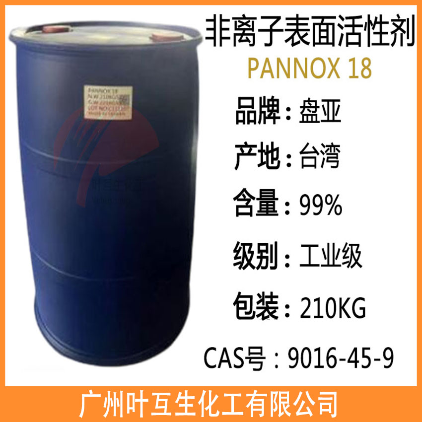 盘亚P18 PANNOX 18 台湾枧油8.6 磐亚乳化剂18 壬基酚聚氧乙烯醚NP8.6 凌飞NP8.6 枧油NP8.6 CAS号:9016-45-9 壬基酚聚氧乙烯醚(NP)广泛用作W/O型乳化剂或O/W型乳化剂、分散剂,是合成洗涤剂主要原料。 NP具有良好的润湿、乳化、分散和匀染性能,在洗涤品,工业表面活性剂等领域应用广泛。