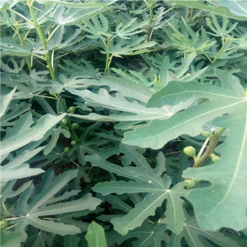 1、青皮无花果苗。鲜食、加工兼用优良品种。该品种适应性广,南方栽培注意控制旺长。树势旺盛,树冠圆长形,主干明显,侧枝开张角度大,多年生枝灰白色。叶大粗糙,色深亮绿,背生茸毛,黄绿,掌状分裂,通常3-5浅裂,裂刻长度不足叶长的1/2,少全缘,基部深心形,叶缘具明显的波状锯齿、圆钝,叶形指数1.12,叶柄平均10.32cm。果实扁、倒圆锥形,果形指数0.86左右。果实熟前绿色,熟后黄绿色,果肉淡紫色,果目小,开张,果面平滑不开裂,果肋明显,果皮韧度较大,果汁较多,含糖量高,夏秋两季果。
