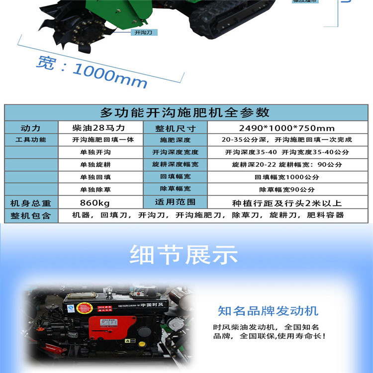 2019新款式履带式开沟施肥回填一体机,可以实现水溶性液体肥料和颗粒肥粉状有机肥同时播撒 ,深松深埋地下并完成回填,多元化施肥,一机多用,节省人工。目前,我国经济作物机械化程度比较低,劳动成本越来越高,传统施肥方式施肥深度较浅,造成作物根系上浮,使作物的抗旱、抗病能力降低,严重影响作物的产量和果品品质,因此我公司研制了自走式多功能开沟施肥机,该机是我公司推出的新发明专利产品,能根据作物生长的不同需求把肥料送到作物根部。提高了作物对养分的吸收能力和肥料的利用率,并且可一机多用。有五大功能:开沟施肥自动回填一次性完成(除土杂肥),单独开沟,更换回填和旋耕装置后可进行回填和旋耕作业,单独除草既减轻了果农劳动强度,提高了生产效率,又节约了劳动和生产成本,机器体积小,重心低,操作灵便,可原地转向,适用于葡萄,果树,枸杞等经济作物的开沟施肥作业