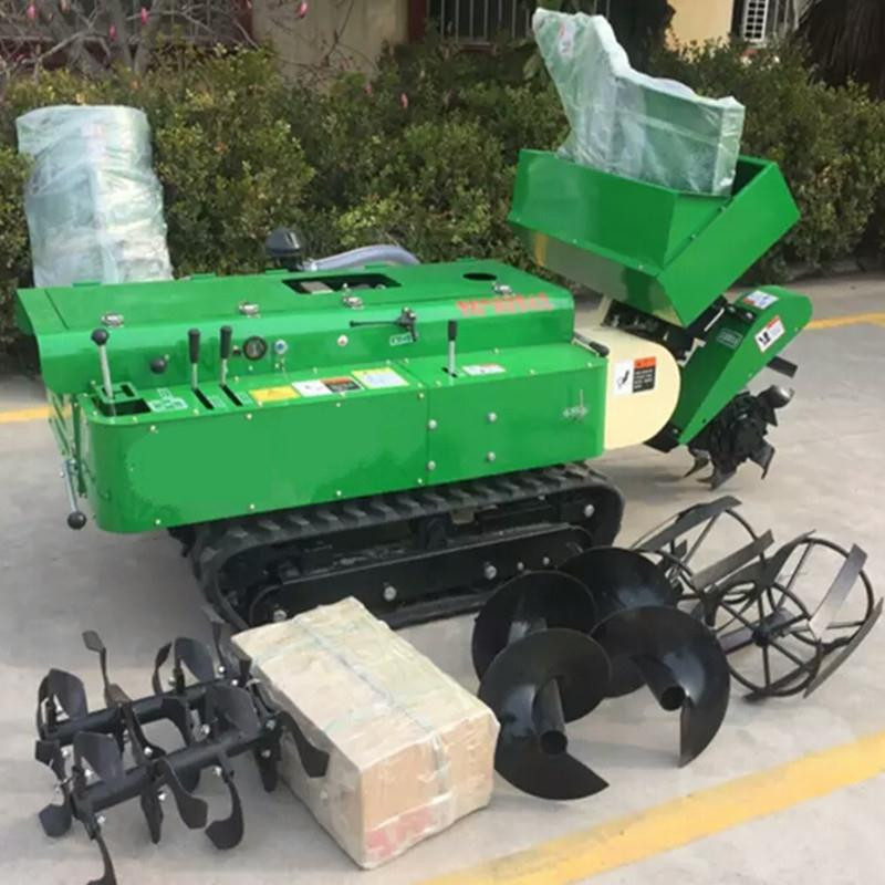 2019新款式履带式开沟施肥回填一体机,可以实现水溶性液体肥料和颗粒肥粉状有机肥同时播撒 ,深松深埋地下并完成回填,多元化施肥,一机多用,节省人工。目前,我国经济作物机械化程度比较低,劳动成本越来越高,传统施肥方式施肥深度较浅,造成作物根系上浮,使作物的抗旱、抗病能力降低,严重影响作物的产量和果品品质,因此我公司研制了自走式多功能开沟施肥机,该机是我公司推出的新发明专利产品,能根据作物生长的不同需求把肥料送到作物根部。提高了作物对养分的吸收能力和肥料的利用率,并且可一机多用。有五大功能:开沟施肥自动回填一次性完成(除土杂肥),单独开沟,更换回填和旋耕装置后可进行回填和旋耕作业,单独除草既减轻了果农劳动强度,提高了生产效率,又节约了劳动和生产成本,机器体积小,重心低,操作灵便,可原地转向,适用于葡萄,果树,枸杞等经济作物的开沟施肥作业