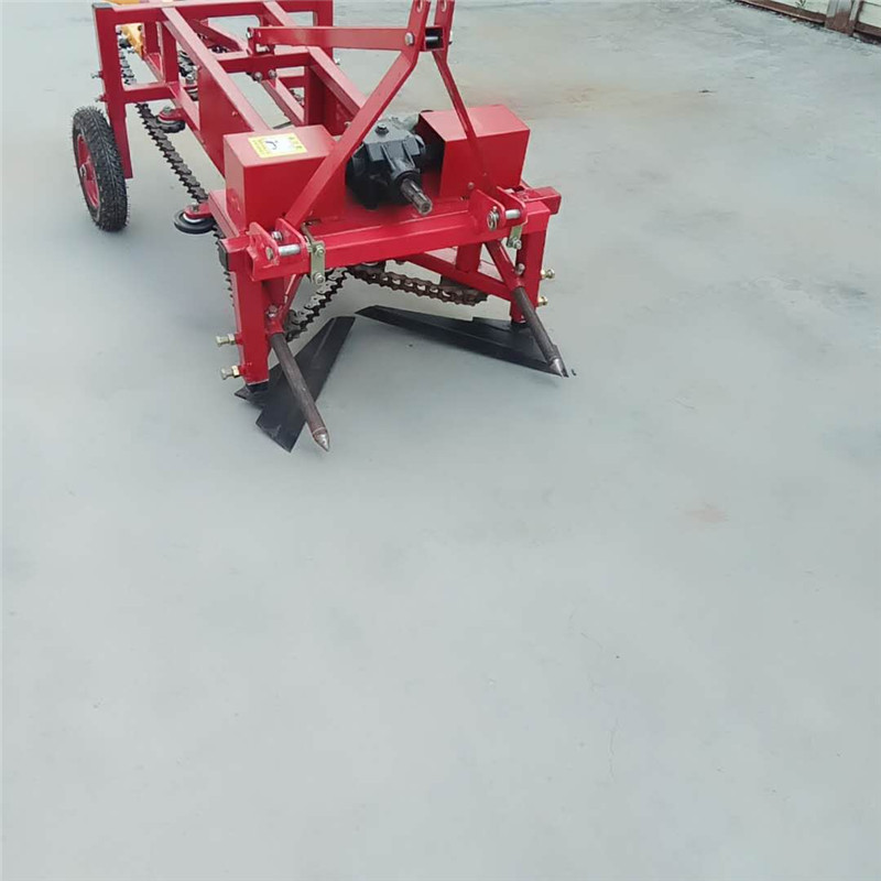 新型拖拉机带动的花生收获机,特有的夹持链设计,可以使收获过程,收获效果更完善,本品具有如下特点:作业流程完整有序,在作业时完成扶秧、挖掘、碎土、抖土和花生的铺放晾晒任务,且损失率低,作业效率高,收获成本低。