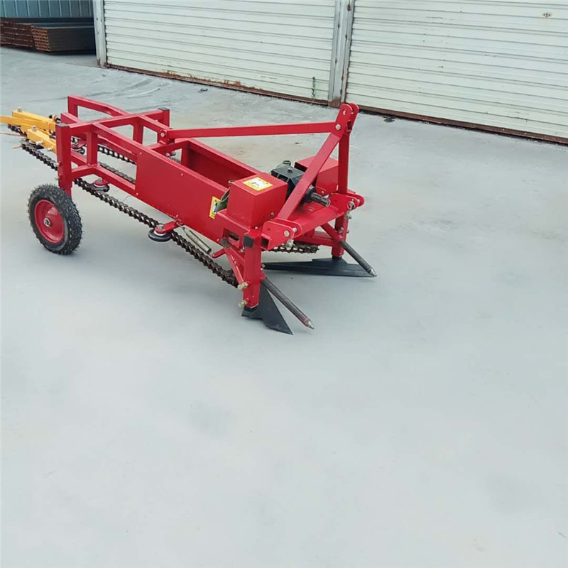 新型拖拉机带动的花生收获机,特有的夹持链设计,可以使收获过程,收获效果更完善,本品具有如下特点:作业流程完整有序,在作业时完成扶秧、挖掘、碎土、抖土和花生的铺放晾晒任务,且损失率低,作业效率高,收获成本低。