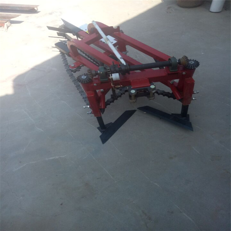 新型拖拉机带动的花生收获机,特有的夹持链设计,可以使收获过程,收获效果更完善,本品具有如下特点:作业流程完整有序,在作业时完成扶秧、挖掘、碎土、抖土和花生的铺放晾晒任务,且损失率低,作业效率高,收获成本低。