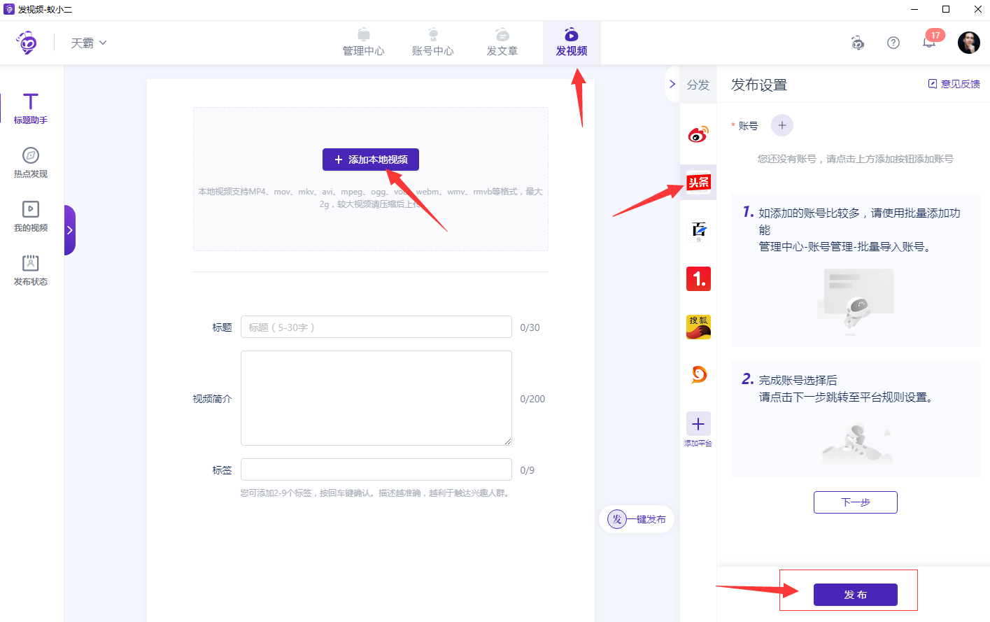 (3)发布作品:账号添加成功之后,选择发布视频的版块,把自己的视频上传,然后从右边(如图)选择需要的平台,然后点击发布就可以了。