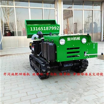 2019新款式履带式开沟施肥回填一体机,可以实现水溶性液体肥料和颗粒肥粉状有机肥同时播撒 ,深松深埋地下并完成回填,多元化施肥,一机多用,节省人工。目前,我国经济作物机械化程度比较低,劳动成本越来越高,传统施肥方式施肥深度较浅,造成作物根系上浮,使作物的抗旱、抗病能力降低,严重影响作物的产量和果品品质,因此我公司研制了自走式多功能开沟施肥机,该机是我公司推出的新发明专利产品,能根据作物生长的不同需求把肥料送到作物根部。提高了作物对养分的吸收能力和肥料的利用率,并且可一机多用。有五大功能:开沟施肥自动回填一次性完成(除土杂肥),单独开沟,更换回填和旋耕装置后可进行回填和旋耕作业,单独除草既减轻了果农劳动强度,提高了生产效率,又节约了劳动和生产成本,机器体积小,重心低,操作灵便,可原地转向,适用于葡萄,果树,枸杞等经济作物的开沟施肥作业